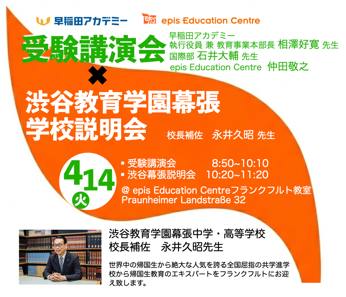 早稲田アカデミー受験講演会と渋谷教育学園幕張中学・高等学校説明会のフランクフルトでの開催が決定いたしました。