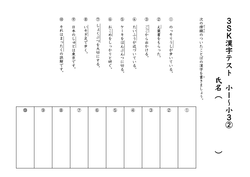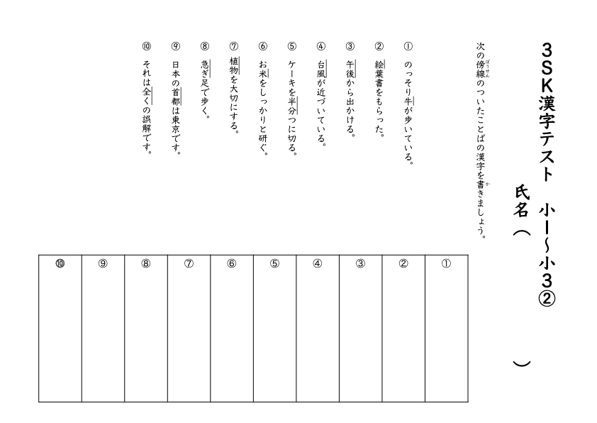 小1、小2の漢字がメインではありますが、熟語で覚出題もあるので、出題される漢字の数は増えています。しっかり練習してきましょう。
