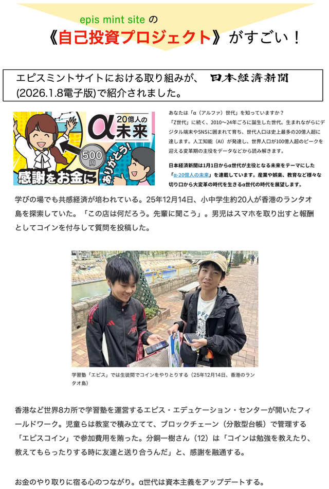 エピスコインが日本経済新聞で紹介されました。 2026.01.08木 イベント 香港 ホンハム 日経新聞の「α-20億人の未来」という年頭の特集で、エピスの新しいチャレンジ、エピスコインがとりあげられました!ぜひ読んでみてください。 https://www.nikkei.com/article/DGXZQOUB025DL0S5A201C2000000/